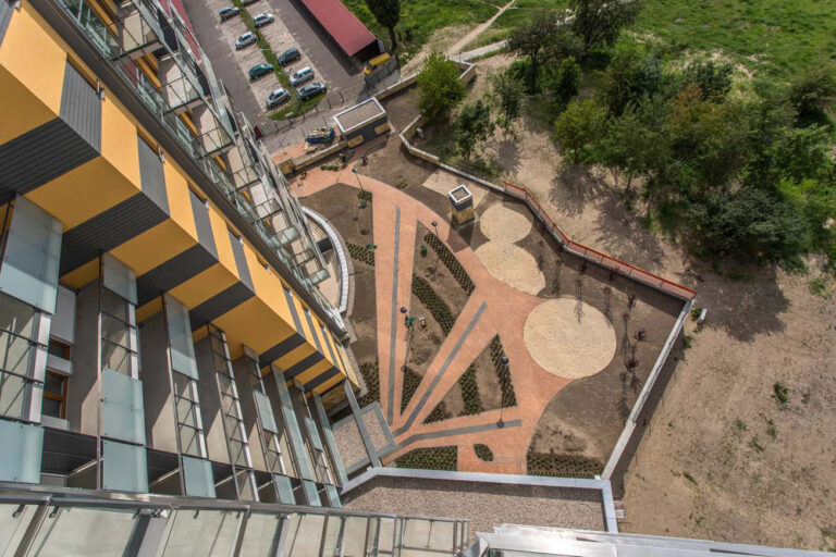 Inwestycja wyróżnia się nowoczesną, a jednocześnie prostą architekturą budynków, podkreśloną ciepłymi barwami elewacji, dużymi balkonami oraz przeszkleniem klatek schodowych. Wszystkie obiekty łagodnie wpisują się w otoczenie starych i pięknych skupisk drzew, zieleni parkowej oraz doliny rzeki Sokołówki z charakterystycznymi, malowniczymi zbiornikami wody.